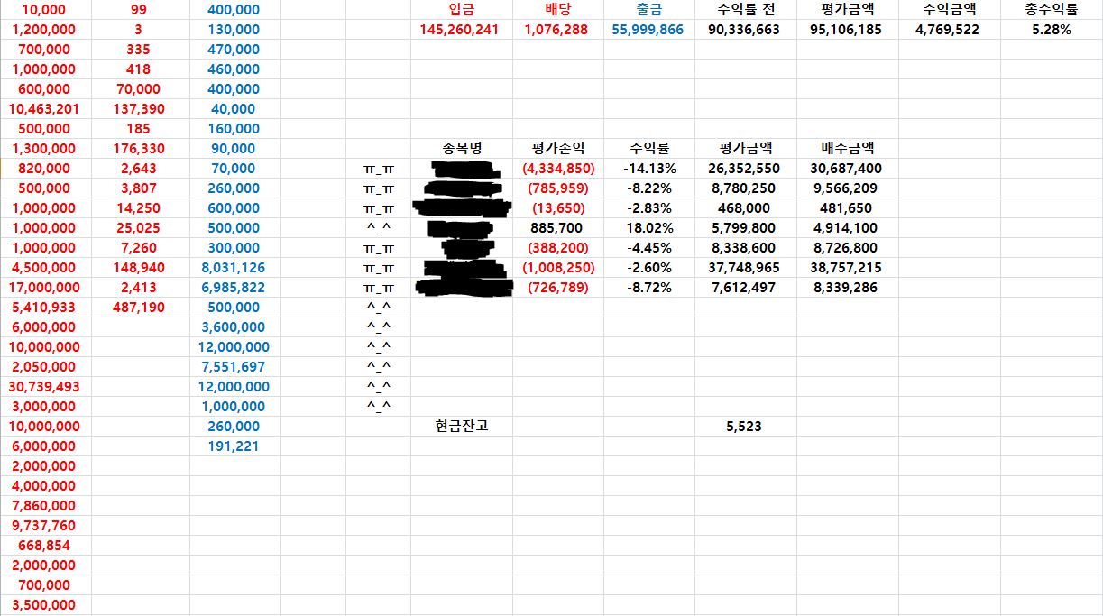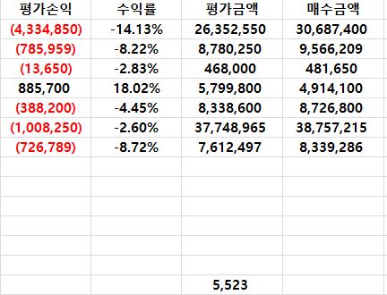 이제 그럼 위 표에 매수금액을 다 더해서 '수익률 전'을 빼면 제가 이제까지
